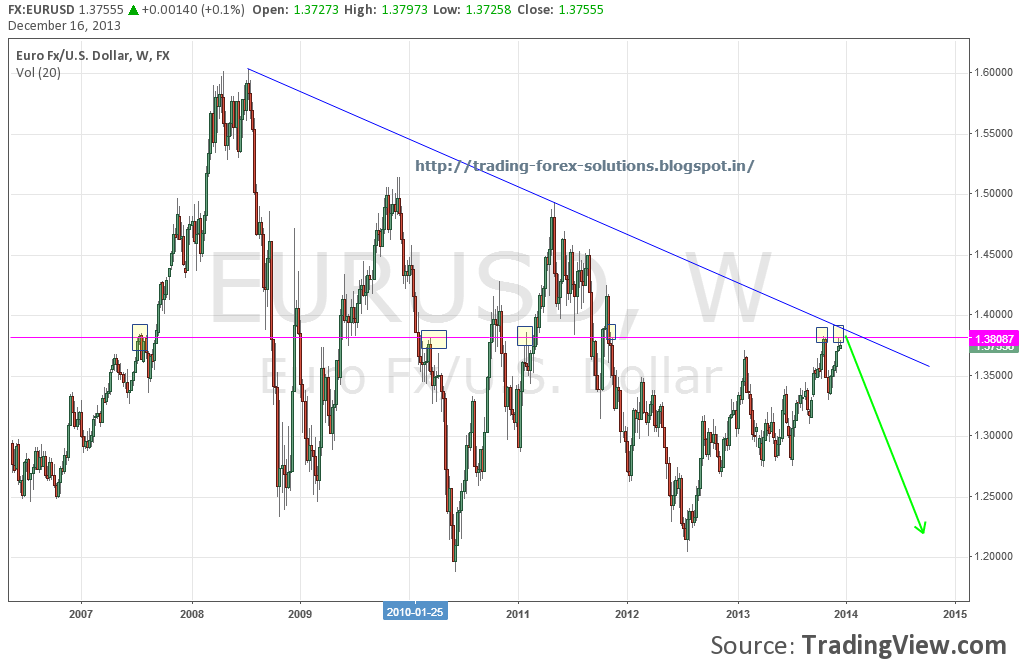 The EURO could be temporarily topped here or it could meander around wiggling its way up for another couple hundred pips to maybe 1.39-40 area. The overall thought here is that the EURO will make a larger move down soon. The arrow exaggerates my thoughts a little, I would like to see 1.30 first. This is a weekly chart so this can take a while to play out. There could be intraday trades going in the opposite direction. Good luck